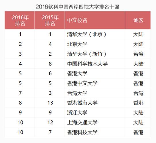 騰訊教育訊 10月18日,上海軟科發布了2016年中國兩岸四地大學排名,清華大學(北京)蟬聯兩岸四地第一名,北京大學躍升至第二名,排名第三的是中國臺灣的清華大學(新竹),中國科學技術大學位列第四,香港大學和香港中文大學并列第五名。澳門地區排名最高的澳門科技大學名列兩岸四地第32名。