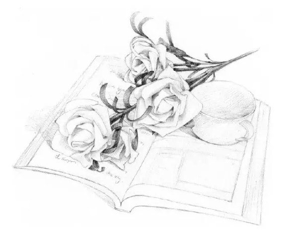 6.最后,加深細化書頁的質感,細化出每一頁紙的效果,可以配合橡皮來擦。加深每個花瓣最重的地方,讓花瓣白色的地方看起來更白,這樣整朵花也就更白了。當然畫面中物體的投影也是非常重要的,正因為有了這些投影,物體才會很結實地落在書本上。但是需要注意,我們平常所看到的投影可不會是一大塊黑色,而是越靠近物體的地方越重,越遠越虛。將畫面描繪完整,一幅可愛的素描便完成了。
