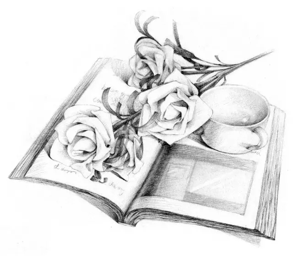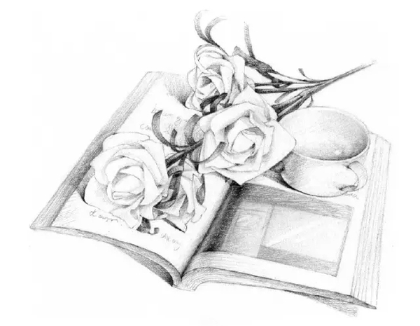 2.在步驟1的基礎上畫出玫瑰花、杯子以及下面的書大致的輪廓。不要畫得太重了,這些還都只是參考線。