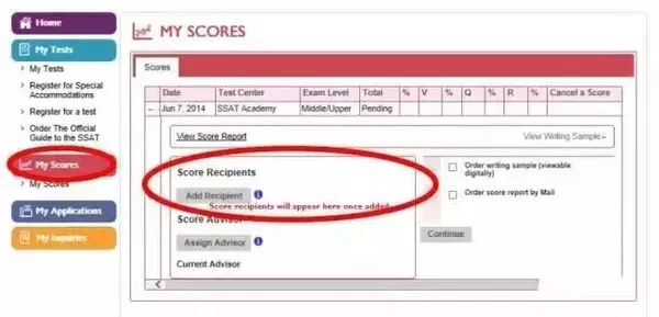如果你在考前已經在SSAT在線系統個人賬戶添加了送分學校,那么學校也將在成績可查詢的第一時間收到你的成績報告,此項為免費服務。