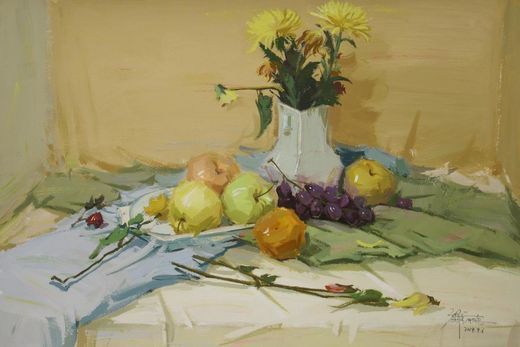 第二遍色畫大面積色塊尤其襯布時(shí)需用疊壓筆觸。