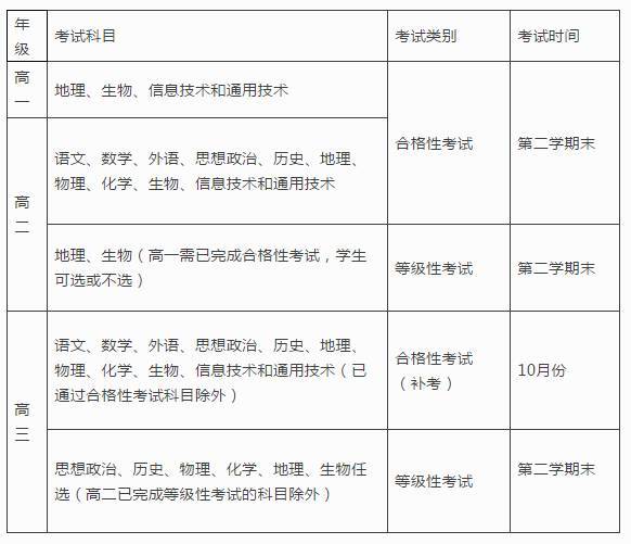 學業水平考試實施第二年開齊合格性考試各科目的考試,第三年開齊等級性考試各科目的考試。實施第三年始學業水平考試的合格性考試、等級性考試及合格性考試的補考每年常態化各安排一次,不同年級的學生根據需要選擇參加。