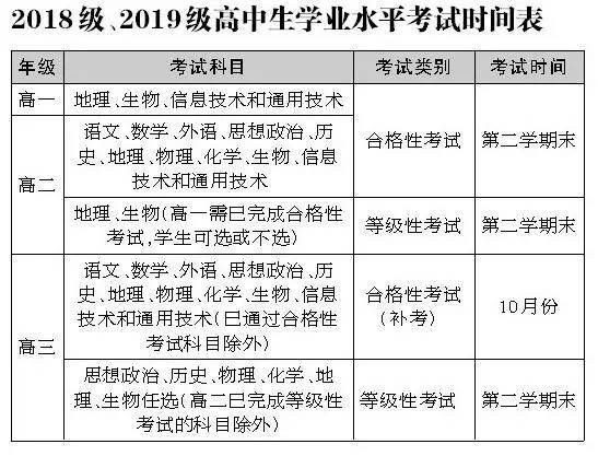 實施起始前兩級(2018、2019級)普通高中在校學生參加學業水平考試的科目可按如下時間安排: