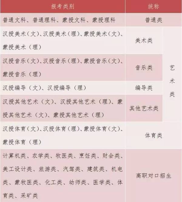 2017年報考類別共包含四大類:普通類、藝術類、體育類和高職對口招生。