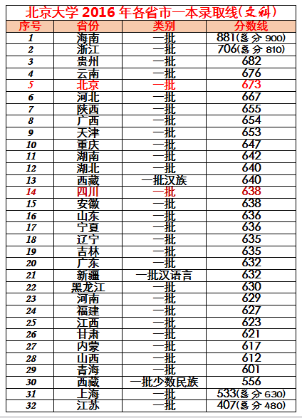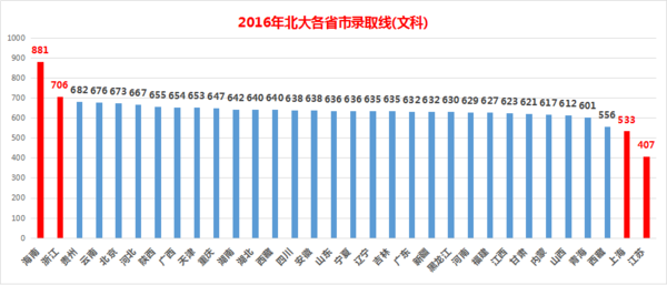 在2016年中,北大在全國各省市文科錄取分數線最高的是前10名省份分別是,海南(881分,總分900)、浙江(706分,總分810)、貴州(682分)、云南(676分)、北京(673分)、河北(667分)、陜西(655分)、廣西(654分)、天津(653分)、重慶(647分)。