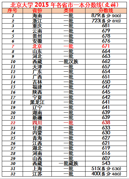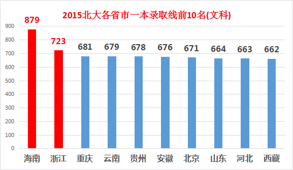 在2015年中,北大在全國各省市文科錄取分數線最高的是前10名省份分別是,海南(879分,總分900)、浙江(723分,總分810)、重慶(681分)、云南(679分)、貴州(678分)、安徽(676分)、北京(671分)、山東(664分)、河北(663分)、西藏(662分,一批漢族)。