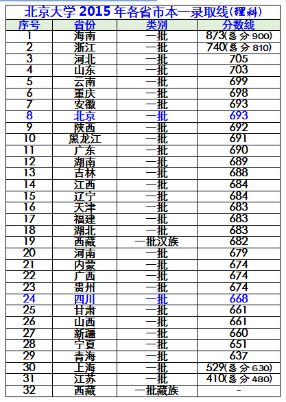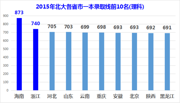 在2015年中,北大在全國各省市理科錄取分數線最高的是前10名省份分別是,海南(873分,總分900)、浙江(740分,總分810)、河北(705分)、山東(703分)、云南(699分)、重慶(698分)、安徽(693分)、北京(693分)、陜西(692分)、黑龍江(691分)。