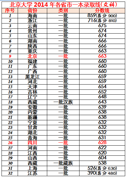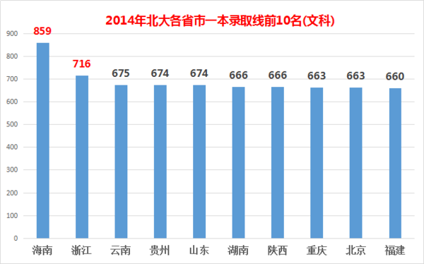 在2014年中,北大在全國各省市文科錄取分數線最高的是前10名省份分別是,海南(859分,總分900)、浙江(716分,總分810)、云南(675分)、貴州(674分)、山東(674分)、湖南(666分)、陜西(666分)、重慶(663分)、北京(663分)、福建(660分)。