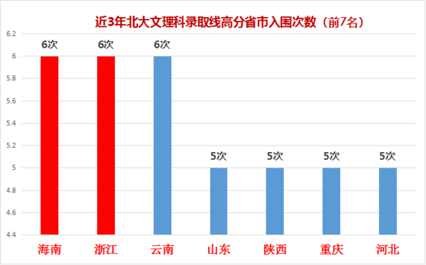 綜合近3年北大在各省錄取線不難看出,連續3年文理科錄取線皆居于前列的省市主要有7個。分別是海南(6次)、浙江(6次)、云南(6次)、山東(5次)、陜西(5次)、重慶(5次)、河北(5次)。
