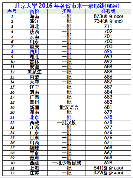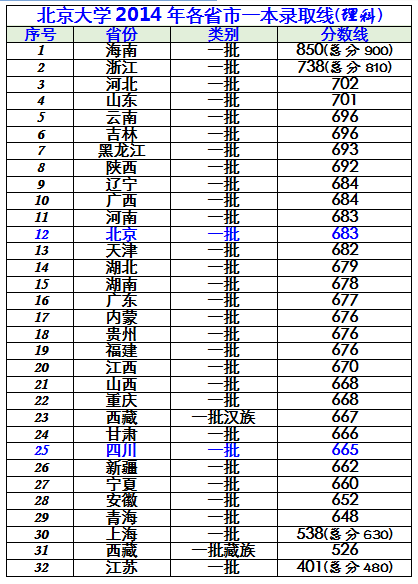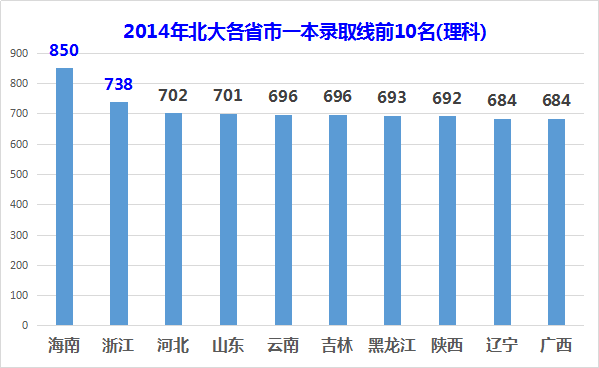 在2014年中,北大在全國各省市理科錄取分數線最高的是前10名省份分別是,海南(850分,總分900)、浙江(738分,總分810)、河北(702分)、山東(701分)、云南(696分)、吉林(696分)、黑龍江(693分)、陜西(692分)、遼寧(684分)、廣西(684分)。