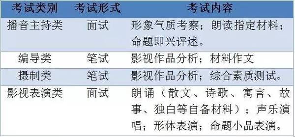 播音主持、編導(dǎo)、攝制、影視表演類等四個(gè)類別專業(yè)省統(tǒng)考的考試形式和內(nèi)容見下表: