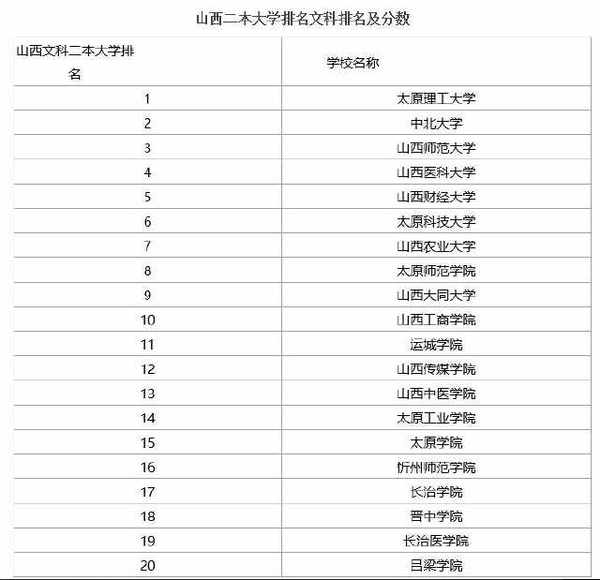 山西省共有20所在本科二批次(文科)招生的大學(xué)參與了排名,其中排名第一的是太原理工大學(xué),排名第二的是中北大學(xué),排名第三的是山西師范大學(xué),以下是山西文科二本大學(xué)推薦名單;