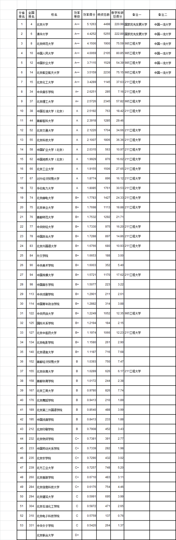 普通高校38所985工程大學(含國家優先發展大學、國家重點建設大學),有30所進入教師效率前38名,占985工程大學的78.95%。有8所211工程大學進入前38名,依次是:北京化工大學、華東理工大學、南京農業大學、華中農業大學、華中師范大學、南京航空航天大學、中央音樂學院、中國石油大學(北京)。