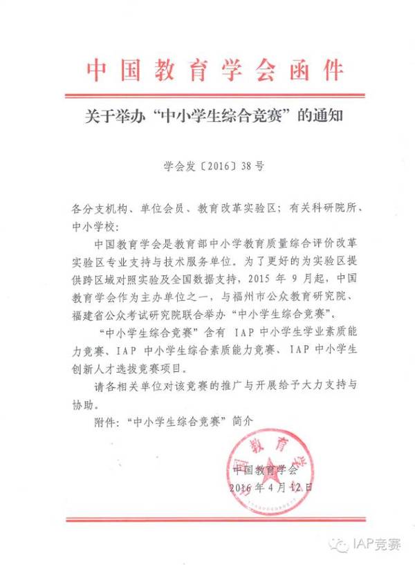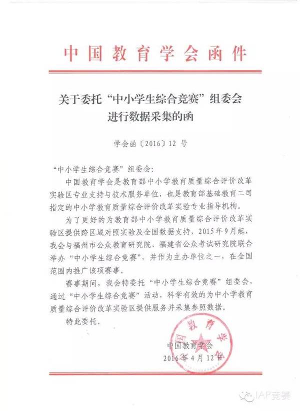 2015年9月,作為教育部中小學教育質量綜合評價改革實驗區專業支持與技術服務單位的中國教育學會發布了《關于舉辦“中小學生綜合競賽”的通知》,正式成為IAP競賽主辦單位之一,與公眾教育研究院等機構聯合舉辦該項賽事。進而,IAP競賽一躍成為教育部中小學教育質量綜合評價改革實驗區跨區域對照實驗項目和全國數據采集方式。競賽使用的技術為“教育部中小學教育質量綜合評價改革實驗”采用的技術,包含,ACTS學業素質能力評價技術、ICTS綜合素質能力評價技術和PCTS發展潛能評價技術。