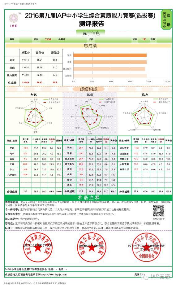 IAP競賽全國總決賽證書由中國教育學會、公眾教育研究院、公眾考試研究院聯合頒發,同時每位參賽選手均獲得一份“素質能力測評報告”,能客觀地對學生的學科特長、個人特質、能力潛質進行鑒定和證明。