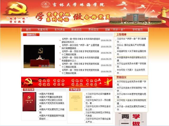 為確保學校“兩學一做”學習教育取得實效,營造良好的黨員學習氛圍,加強黨的思想政治建設,促進全校黨員遵守黨章黨規,樹立正確行為規范,用習近平總書記系列重要講話精神武裝頭腦、指導實踐、推動工作,做“四講四有”的合格黨員。由黨委辦公室推出的吉林大學珠海學院“兩學一做”新聞專題(http://lxyz.jluzh.com/)于6月1日正式開通。
